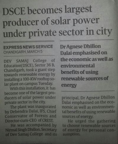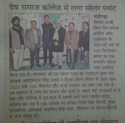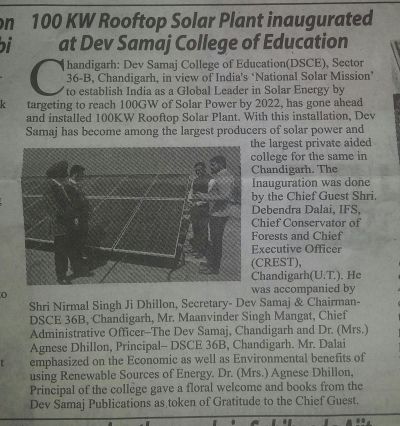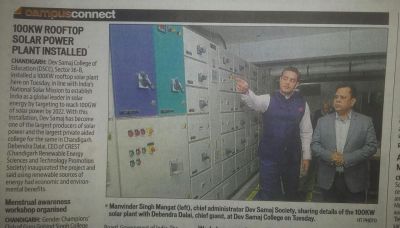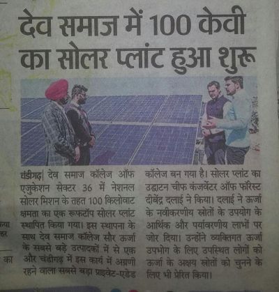 Dev Samaj College of Education, Sector 36-B, installed a 100KW rooftop solar plantin line with India’s mission to establish India as a global leader in solar energy.